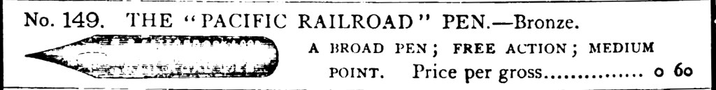 - There were at least three different manufacturers of 149 Pacific Railroad pens. (and no evidence of an actual Pacific Railroad). We know Turner & Harrison made a 149 Pacific Railroad pen under the Constitution brand. We know Esterbrook made one, and there appears to be someone making a 149 Pacific Railroad pen into the early 20th-century, after the last evidence of either Esterbrook or Tunrer & Harrison making their version.