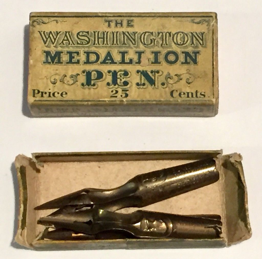- The Washington Pen was produced sometime between 1864 until in 1868 Esterbrook was sued by The Washington Medallion Pen Company for trademark infringement for copying their pen design and box design.