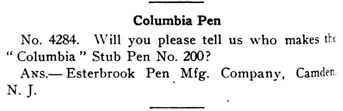 - This could indicate that there was a #200 Columbia Stub Pen as part of the Columbia line of pens. Or it could be a typo and they meant #400 Columbia Stub Pen, which we know existed.