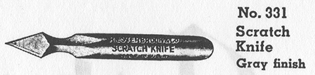 - “Razor sharp for retouching, erasing and cutting. Fits all penholders. Of invaluable aid to the user of fine line pens. Gray finish.”