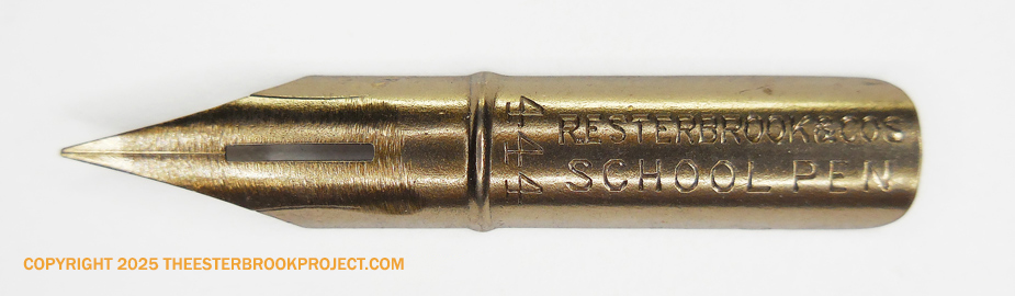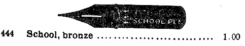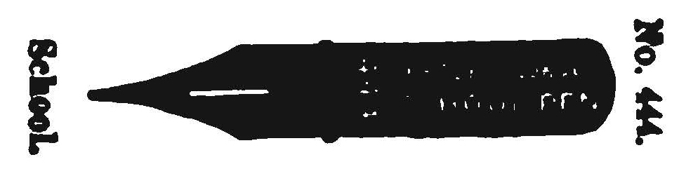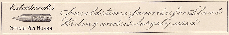 - Originally issued as the #404 School Pen, but that ran afoul of the Gillott #404 School Pen. After Gillott sued Esterbrook, the number was changed to #444. The earliest image below is a salesman sample book from a year or so after the lawsuit, and they’re obviously using old 404s with the new label.