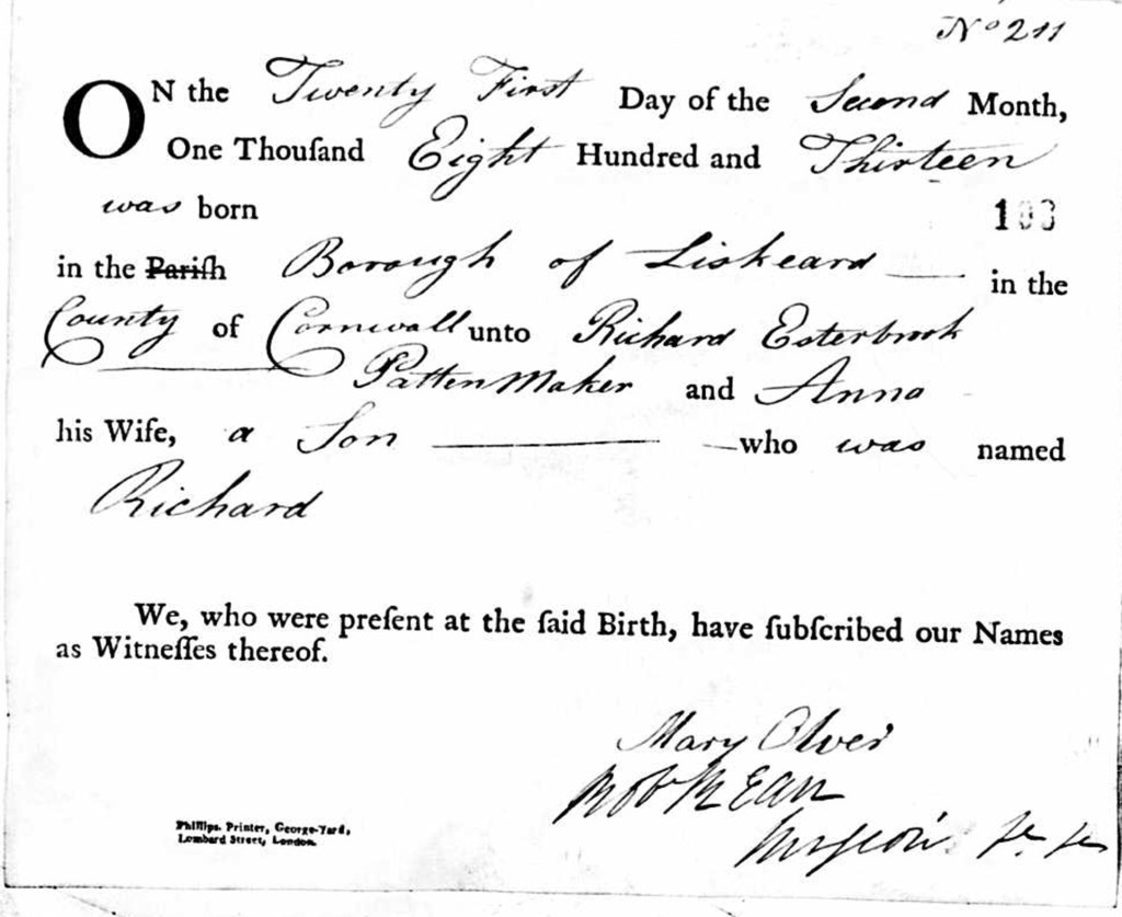 Richard Esterbrook, first of his name, not only held the various jobs mentioned above, but he was also a devout member of the Society of Friends (Quakers) until his death in 1846. He is buried in the Society of Friends graveyard in Liskeard.