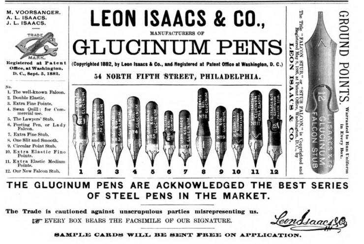 In 1886, a small, but quality producer of steel pens in Philadelphia, Leon Isaacs, develops and trademarks a pen called the #12 Falcon Stub. Isaacs was very careful about trademarking his designs and branding, and in this case he trademarked both the terms “Falcon Stub” as well as “Stub Falcon.”